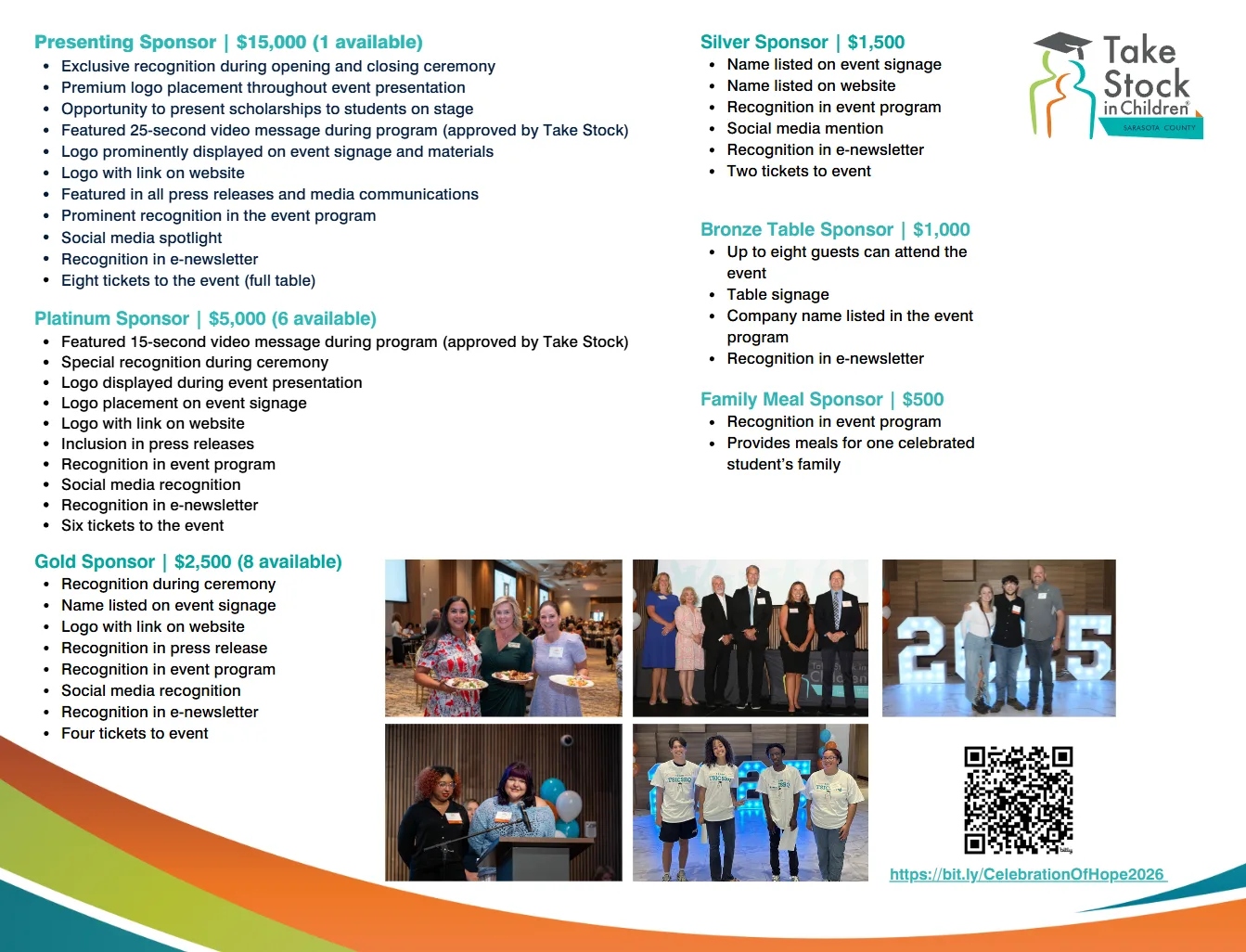 For over 30 years, Take Stock in Children of Sarasota County has been transforming lives through education, mentorship, and hope. Our Celebration of Hope event honors this remarkable journey as we recognize our 2026 graduating students and the dedicated mentors who helped guide their path to success.