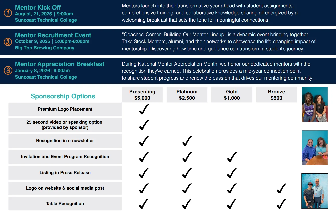 Mentors offer support, guidance, and encouragement, and are a vital part of our Take Stock program for our students. Your sponsorship supports our Mentor program by funding one of the key events below, enabling our mentors to help a child build confidence, establish a solid foundation of values, set goals, and improve their academic and life skills. Choose the sponsorship opportunity that resonates the most.